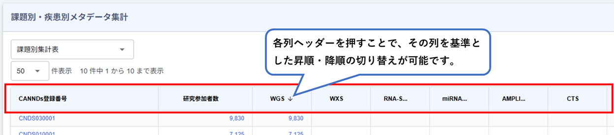 また、課題別集計表やデータセット一覧などの表形式の一覧には、ソート機能も備わっています。