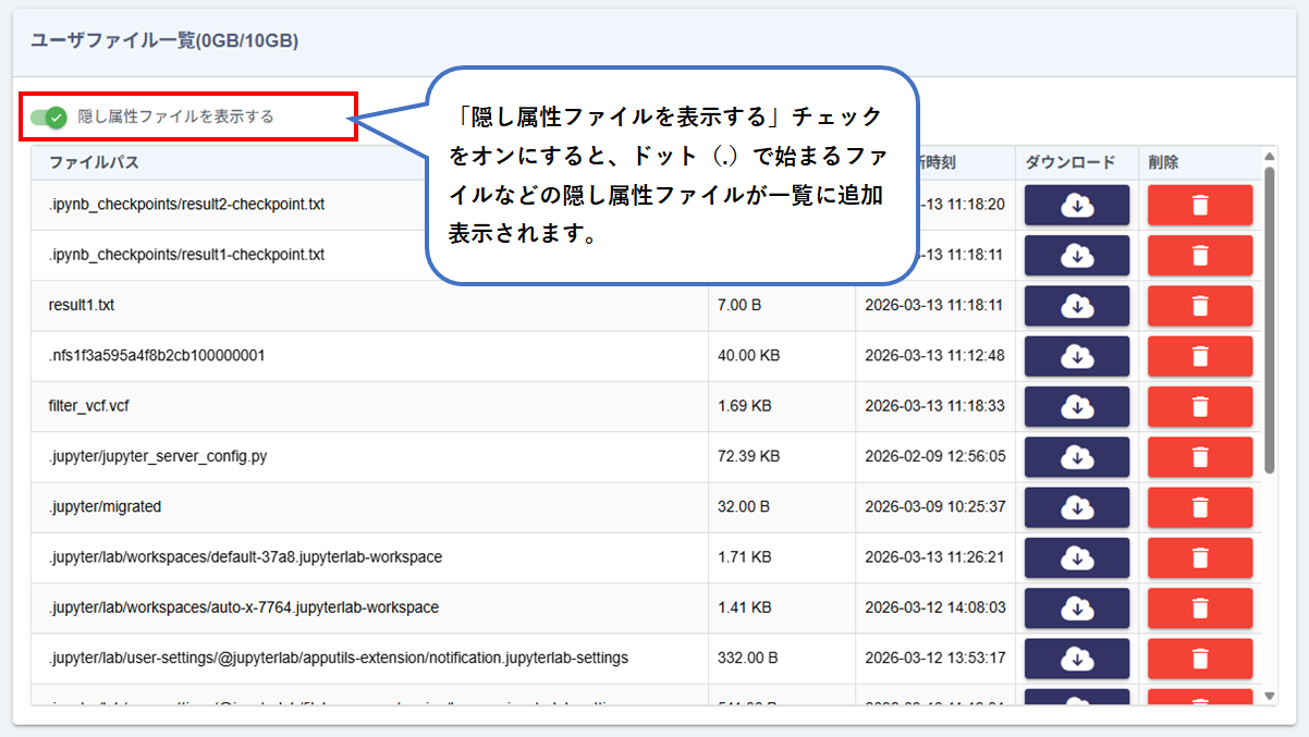 表示されたファイルは、ダウンロードまたは削除が可能です。