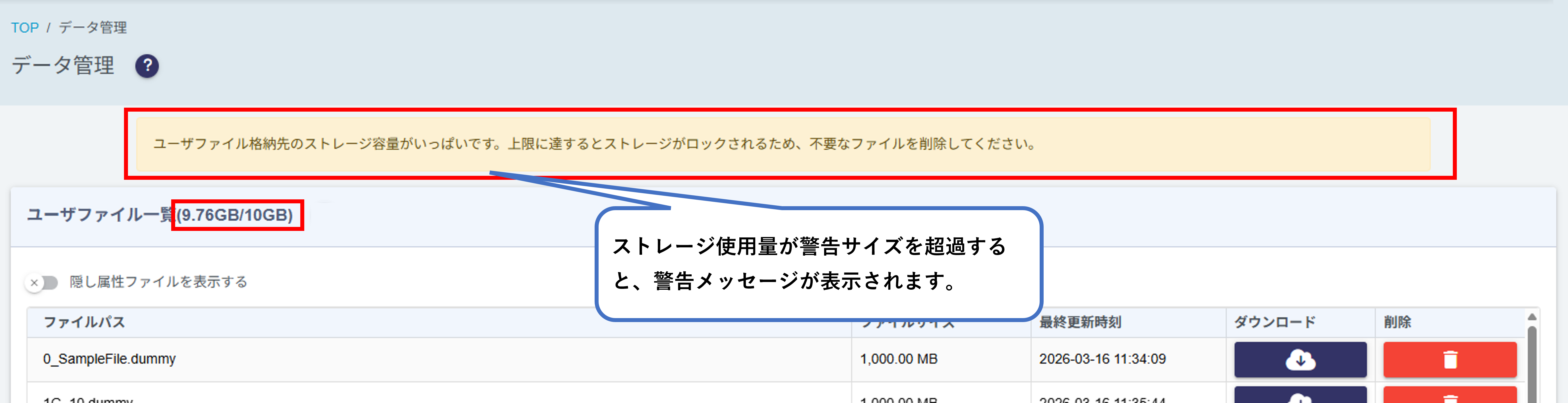 格納されているファイルサイズの合計が上限サイズを超過した場合、警告が表示され、
