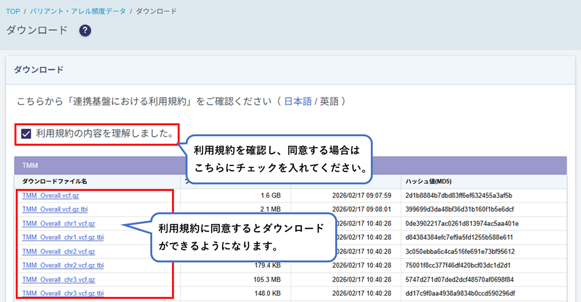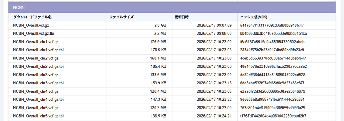 バリアント一覧画面に表示しているSites-Only VCFの一部のファイルをダウンロードできます。