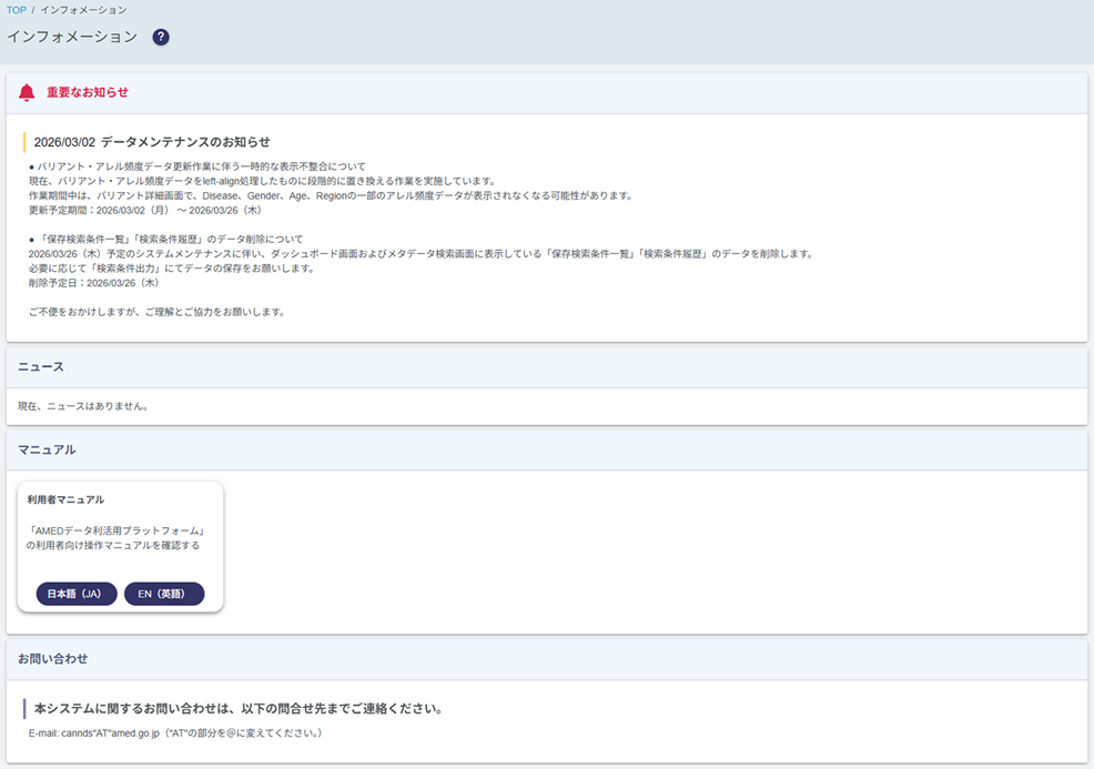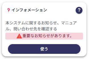 重要なお知らせ、ニュース、利用者マニュアル、お問い合わせ情報を確認できます。