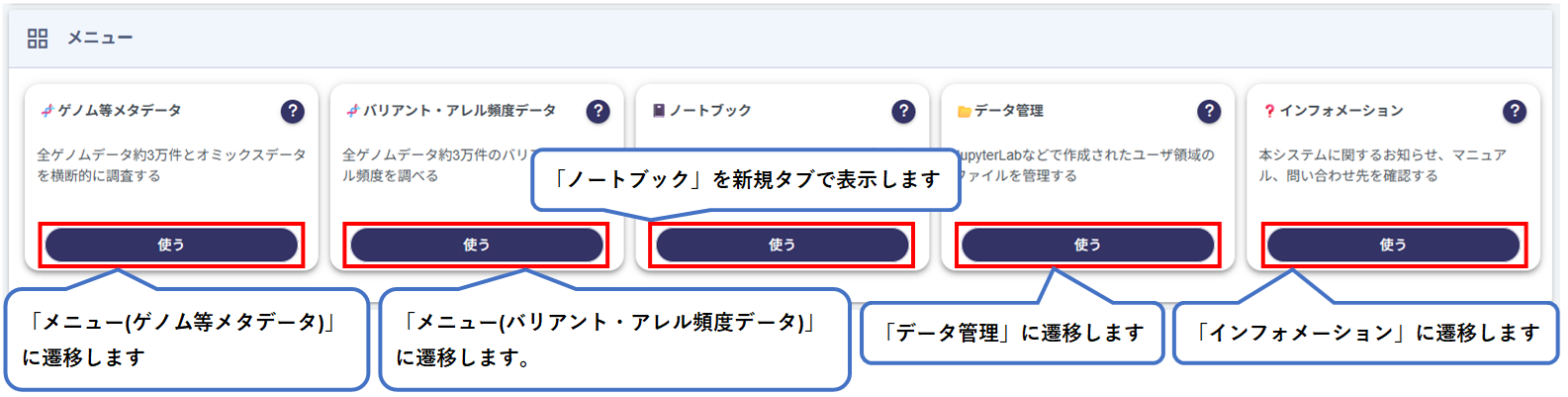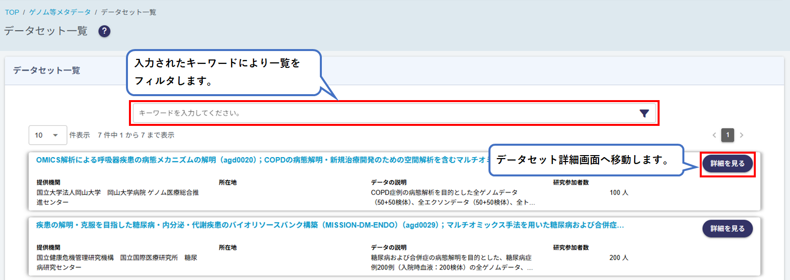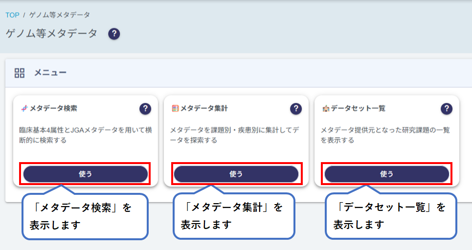 本システムに登録されている研究課題(データセット)の一覧が表示されます。