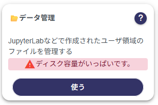 | ファイルサイズ | /shareを除いた領域には、以下の制約があります ・合計サイズに上限があります ・上限および現在の使用状況は、データ管理に「ユーザファイル一覧(現在の使用量/上限)」として表示されています ・上限を超過すると、ノートブックの利用がロックされます ・ロック中は、ファイル操作やダウンロードが出来なくなります ・上限超過前に警告メールがユーザに送信され、超過後にはロック通知メールが送信されます ・ロック解除の方法については、お問い合わせください |