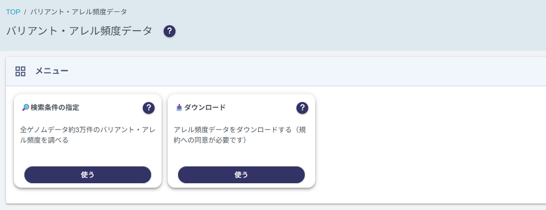 バリアント・アレル頻度データはデータ量が非常に多いため、バリアント一覧に遷移する前に条件を指定してデータの範囲を絞り込む必要があります。