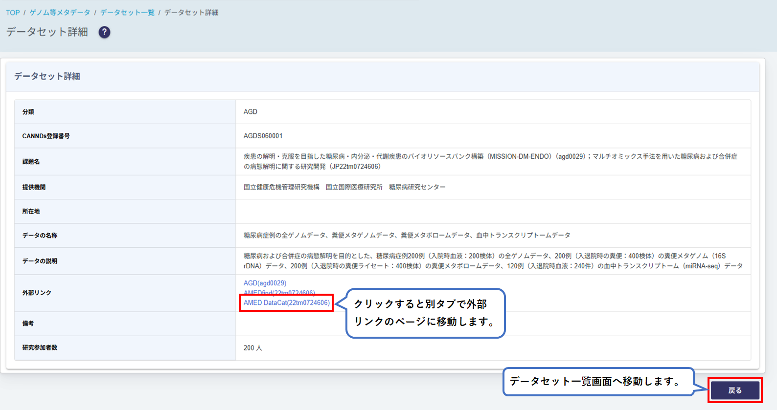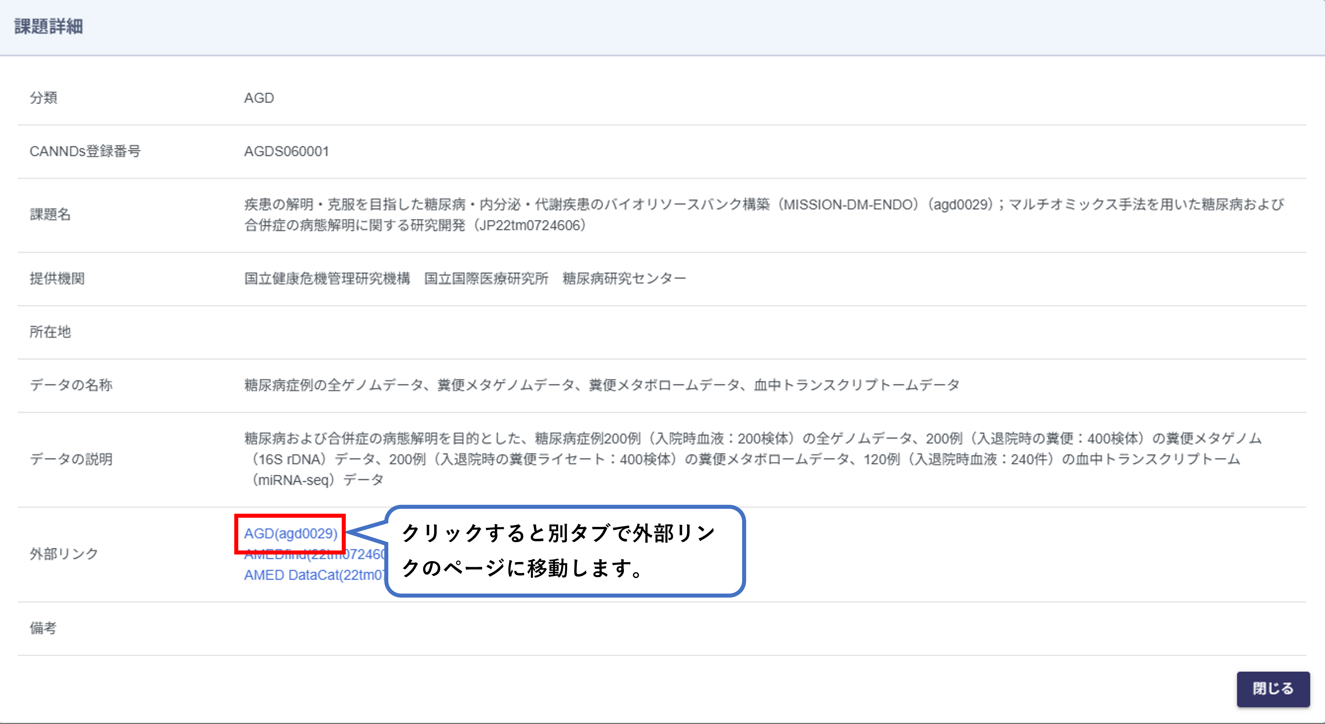 データセット一覧画面で選択した研究課題(データセット)の詳細が表示されます。