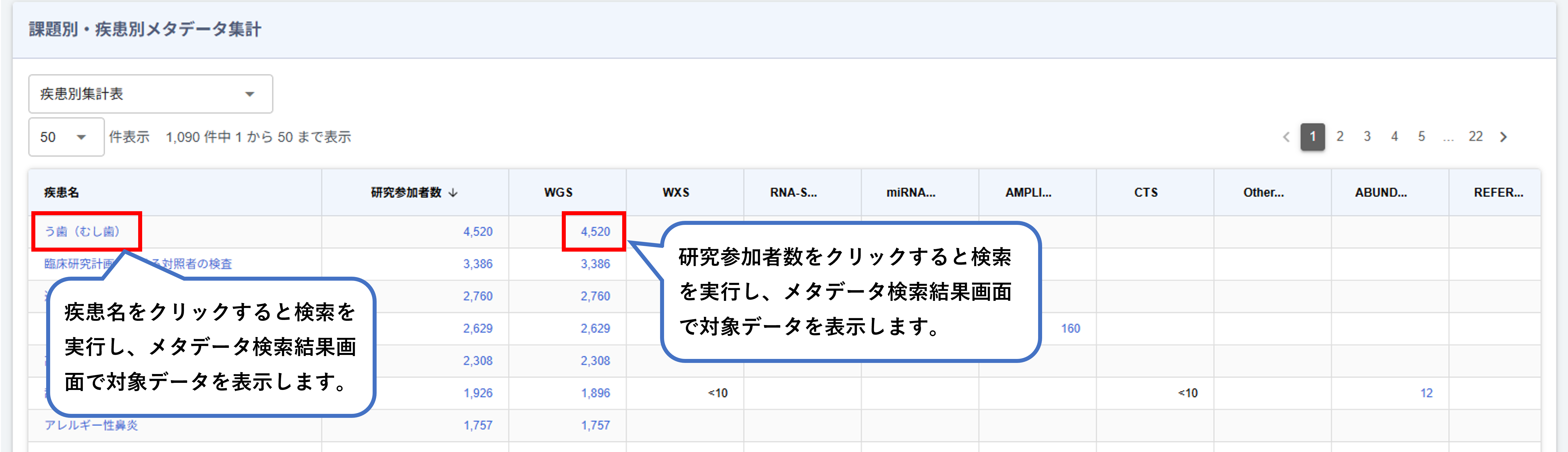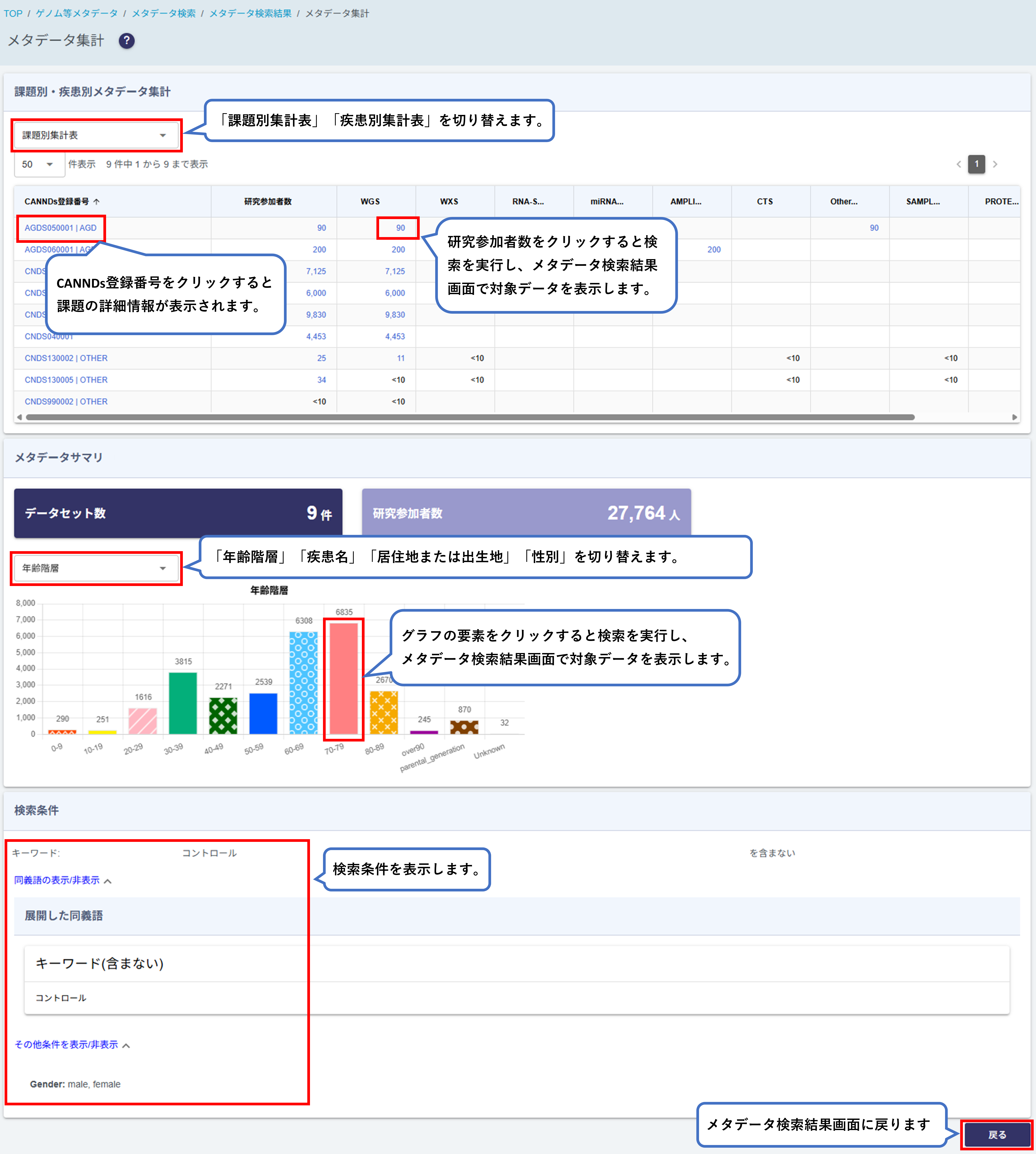 メタデータの登録件数、「年齢階層」「疾患名」「居住地または出生地」「性別」の集計グラフ、メタデータの課題別、疾患名別の集計表を表示します。