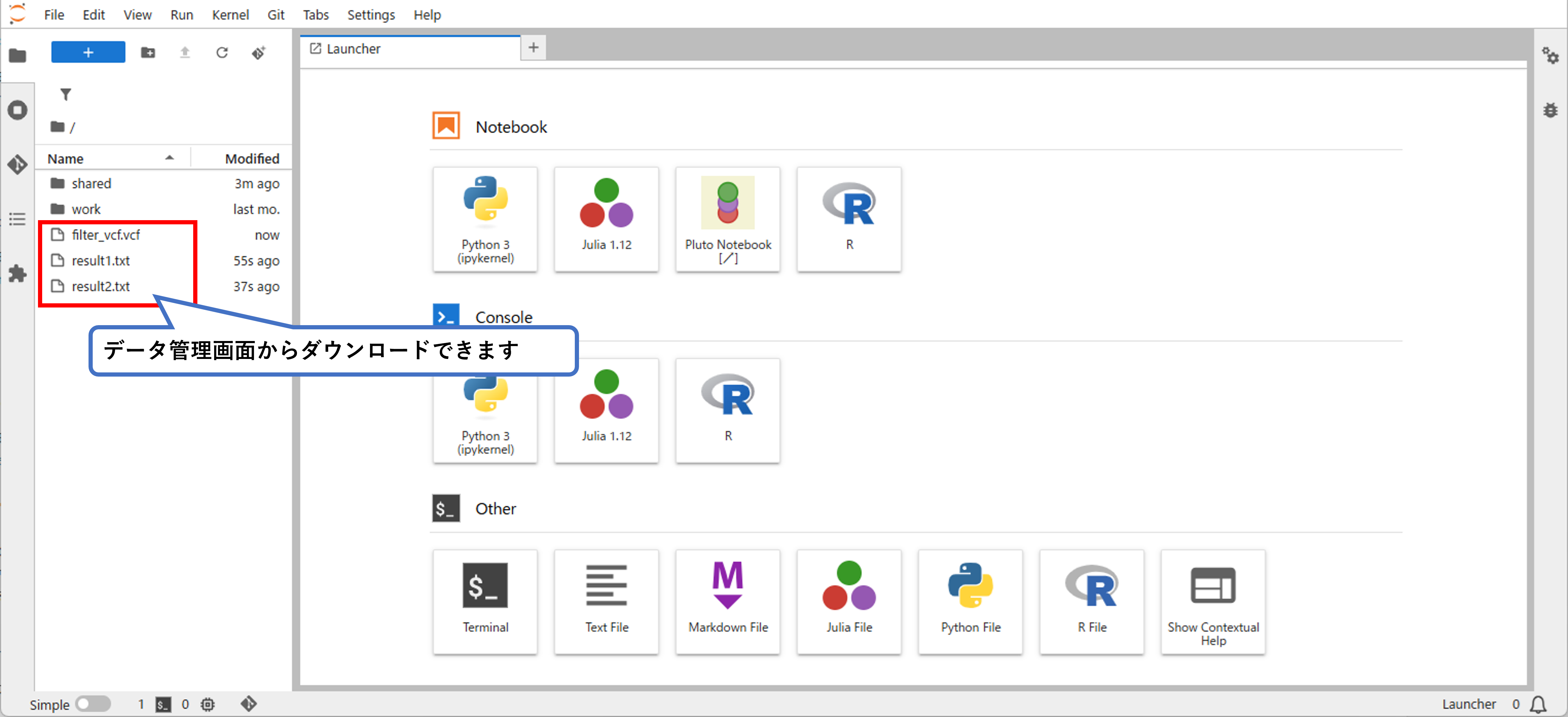 本画面上でPythonやRを含む、簡単なデータ処理や解析を実行できます。